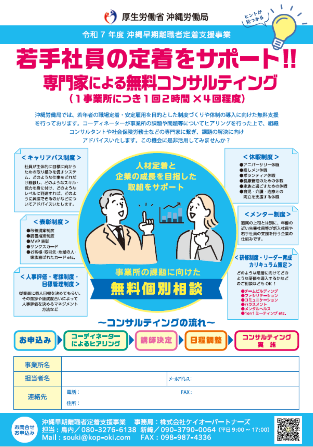 沖縄労働局では、若年者の職場定着・安定雇用を目的とした制度づくりや体制の導入に向けた無料支援を行っております。