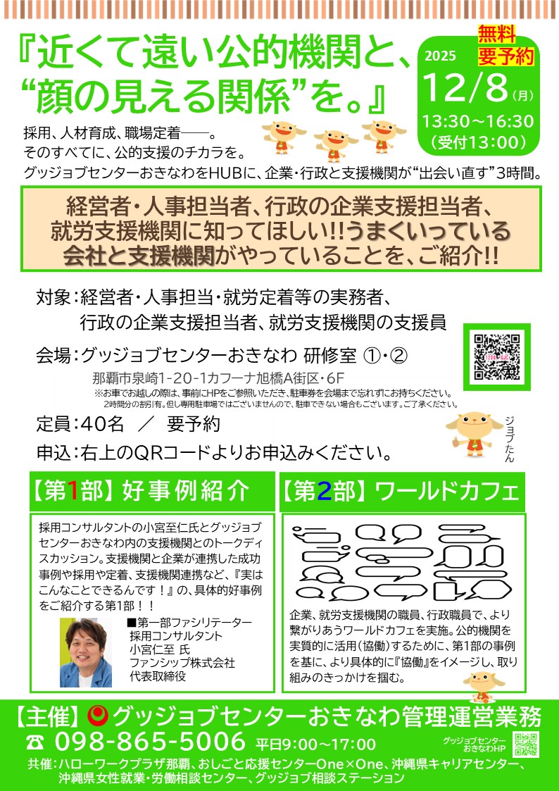 グッジョブセンターおきなわをHUBとした、就労支援機関の活用方法を学び、雇用機会の拡大に向けたより効果的な協働体制の形成を目指す内容。