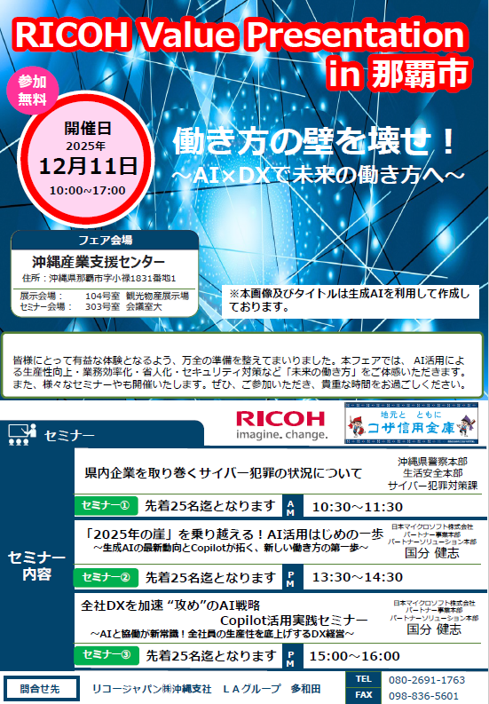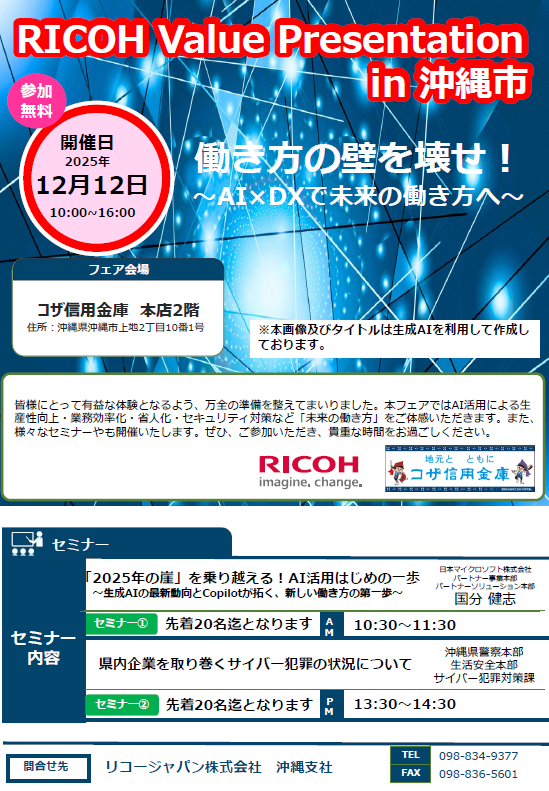 コザ信用金庫は、人手不足を課題とする取引先企業のデジタル化およびDX化支援の一環として、リコージャパン株式会社との連携によるDX体験会を開催します。